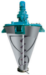 由擺線針輪減速機(jī)連接中心螺桿及外層螺帶以相同轉(zhuǎn)速轉(zhuǎn)動。工作時,中心螺桿將混合物料由底部提升到頂部,同時線速度較大的外部螺帶將物料由下而上沿錐形筒壁盤提升,二種運動在離心力作用下又將物料沿切線方向拋向空間,物料產(chǎn)生強(qiáng)烈的對流剪切、擴(kuò)散,從而達(dá)到快速混合的目的。(螺桿也可做成反向螺桿)。