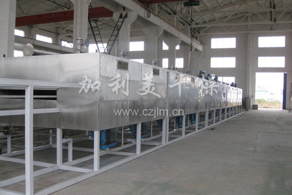 物料由加料器均勻地鋪在網(wǎng)帶上,網(wǎng)帶一般采用12-60目不銹鋼絲網(wǎng),由傳動裝置拖動在干燥機內(nèi)移動。干燥機由若干單元組成,每一單元熱風(fēng)獨立循環(huán),部分尾氣由專門排濕風(fēng)機排出,廢氣由調(diào)節(jié)閥控制,熱氣由下往上或由上往下穿過鋪滿物料的網(wǎng)帶完成熱量與質(zhì)量傳遞的進程,帶走物料水份。網(wǎng)帶緩慢移動,運行速度可根據(jù)物料溫度自由調(diào)節(jié),干燥后的成品連續(xù)落入收料器中。上下循環(huán)單元根據(jù)用戶需要可靈活配備,單元數(shù)量亦可根據(jù)需要選取。
