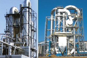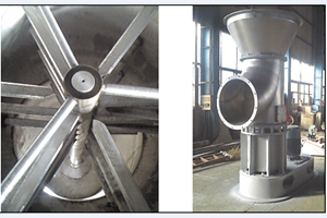 底部強化器設(shè)計獨特,攪拌齒為菱形,其流線性能使風(fēng)阻達到低,設(shè)置在圓錐形料斗內(nèi),分動刀和定刀,粉碎效果顯著,使下落的結(jié)塊物料迅速粉碎為適合氣流干燥的粉粒料,攪拌的另一個主要作用是分散物料,加大了與料斗下面進來的高速熱風(fēng)的接觸面積,于是料斗區(qū)形成了一個強烈傳熱傳質(zhì)的流化床,大部分濕分在料斗區(qū)燥。隨著干燥的進行,變輕變細(xì)的干料受氣流作用明顯,與氣流一起上升并進一步干燥,然后從干燥塔頂部出來進入物料收集系統(tǒng)。