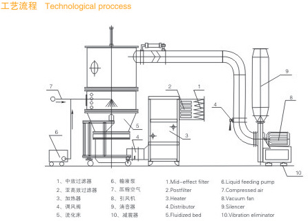 物料粉末粒子,在原料容器(流化床)中呈環(huán)形流化狀態(tài),受到經(jīng)過凈化后的加熱空氣預(yù)熱和混合,將粘合劑溶液霧化噴入,使若干粒子聚集成含有粘合劑的團(tuán)粒,由于熱空氣對物料的不斷干燥,使團(tuán)粒中水分蒸發(fā),粘合劑凝固,此過程不斷重復(fù)進(jìn)行,形成理想的、均勻的多微孔球狀顆粒。